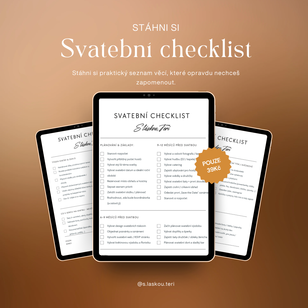Checklist je navržen tak, aby tě provázel celým svatebním obdobím s lehkostí a přehledností. Můžeš si ho vytisknout, doplňovat poznámkami, nebo mít stále po ruce v mobilu. Jeho cílem je jediné: přinést ti klid, jistotu a prostor naplno si užívat každý okamžik.